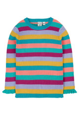 Organic cotton knitted rib jumper with lettuce finish at the sleeve. GOTS Organic Certified by Soil Association Certification Licence Number DK22283. This garment is part of Frugi’s Circular Collection, meaning it has been designed to be recycled into new fabrics at the end of its life, helping reduce textile waste. How to Recycle: For UK customers: Request a free returns label by completing the Recycle Me form at welovefrugi.com/recycleme. For customers outside the UK: Please send your item(s) to: Returns: RECYCLE ME Frugi Unit 2 & 2A Lodge Way Indian Queens Industrial Estate St Columb Cornwall TR9 6TF Please package the item securely. Ensure it is clean and that any added repairs or patches have been removed, so the garment is returned in its original fabric state, ready for recycling. Frugi then collate recyclable garments before sending to their partner, LMB, who uses textile to textile recyclers to convert them into new fabrics, helping reduce textile waste. Scan the QR code on the care label for additional FAQs about the recycling process.