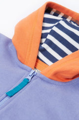 Cosy Organic Cotton brushback 1/4 zip hoody with feature applique front pocket, rib cuffs and hem. and lined hood. GOTS Organic Certified by Soil Association Certification Licence Number DK22283. This garment is part of Frugi’s Circular Collection, meaning it has been designed to be recycled into new fabrics at the end of its life, helping reduce textile waste. How to Recycle: For UK customers: Request a free returns label by completing the Recycle Me form at welovefrugi.com/recycleme. For customers outside the UK: Please send your item(s) to: Returns: RECYCLE ME Frugi Unit 2 & 2A Lodge Way Indian Queens Industrial Estate St Columb Cornwall TR9 6TF Please package the item securely. Ensure it is clean and that any added repairs or patches have been removed, so the garment is returned in its original fabric state, ready for recycling. Frugi then collate recyclable garments before sending to their partner, LMB, who uses textile to textile recyclers to convert them into new fabrics, helping reduce textile waste. Scan the QR code on the care label for additional FAQs about the recycling process.