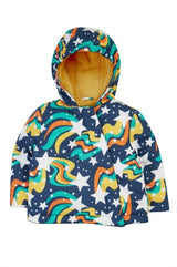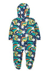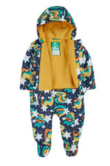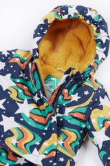 Recycled Polyester made from post-consumer recycled plastic. fabric is rated 3000MVP for breathability. PFC free durable water repellent finish. Features detachable pull ups that attach with zip and poppers, 3 piece panel hood with elastication for the perfect fit, jacket lined with long pile fleece and drop liner to sleeve for easy dressing, and popper fastening down the front.