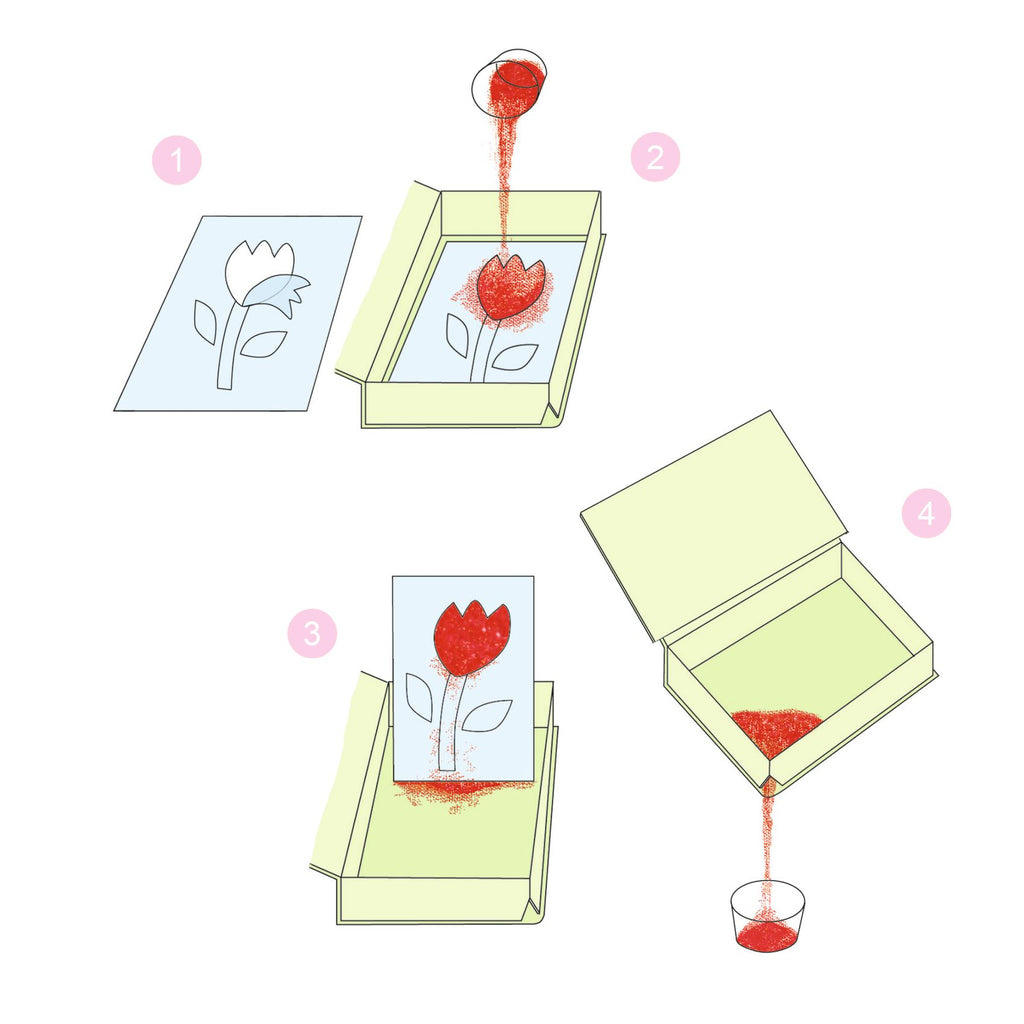 4 illustrated and pre-pasted cards (15 x 21 cm), 9 pots of coloured sand, 2 tubes of glitter, 1 plastic tool, 1 colour step-by-step instruction booklet.
