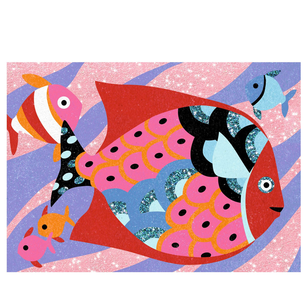 4 fish-themed pictures to brighten up with coloured sand and glitter. Children place the picture in the box, use the tool provided to expose the pre-pasted areas, and sprinkle over the coloured sand and glitter following the colour-coded instructions. Once they are finished, the colours in the pictures are revealed and the fish sparkle and shine!