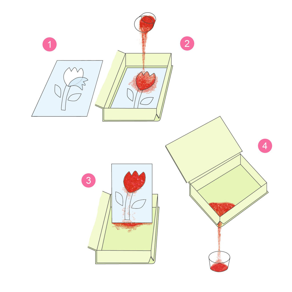 4 illustrated and pre-pasted cards (15 x 21 cm), 9 pots of coloured sand, 2 tubes of glitter, 1 plastic tool, 1 colour step-by-step instruction booklet.