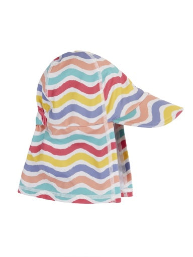 Sun-safe swim hat. Chlorine safe colours and Prints. This item is made from post-consumer recycled plastic, helping to create a brighter future by giving old materials a new life.PLEASE NOTE: Remove when baby is sleeping. This fabric has a UPF rating of 50+ (conforms to standard AS4399.2020), which keeps delicate skin safe in the sun. UV protection factor blocks the harmful rays of the sun and provides UVA and UVB protection. WARNING: • Sun exposure causes skin damage. • This garment does not replace the use of sunscreen. Always apply a high factor sunscreen. • The protection offered by this garment may be reduced with use or if stretched or wet. • Stay in the shade between 11 am and 3 pm. • Keep babies out of the sun. • The UPF rating applies only to the area of skin covered. Protection may be reduced if the material is wet, stretched or from the effects of normal wear or exposure to chemicals. For best sun protection use hats, clothing that provides maximum skin coverage, sunglasses, sunscreen and shade. • If used regularly, or for long periods of time, in chlorinated water then the bright colours can fade and damage to the fabric might occur - please remember to rinse me thoroughly with fresh water after use. To prolong the life of this garment it is recommended to: • Dry garment away from direct heat and sunlight. • Always rinse in fresh water after use. • Not store in a damp condition. • Avoid rough surfaces.