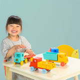 Based on a retro design, the simple clean lines give this traditional toy a refreshing look and feel. A classic big red truck with yellow trailer and pale blue wheels.
