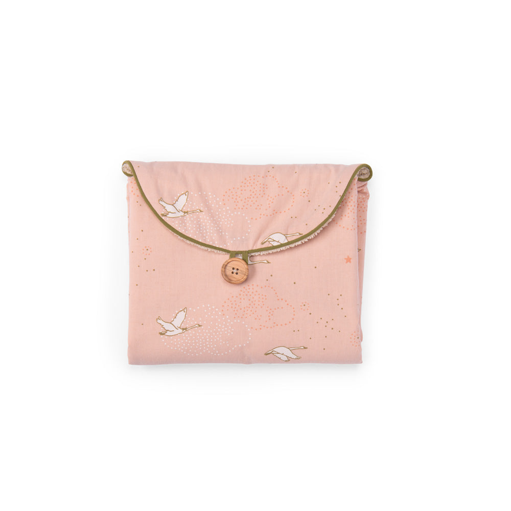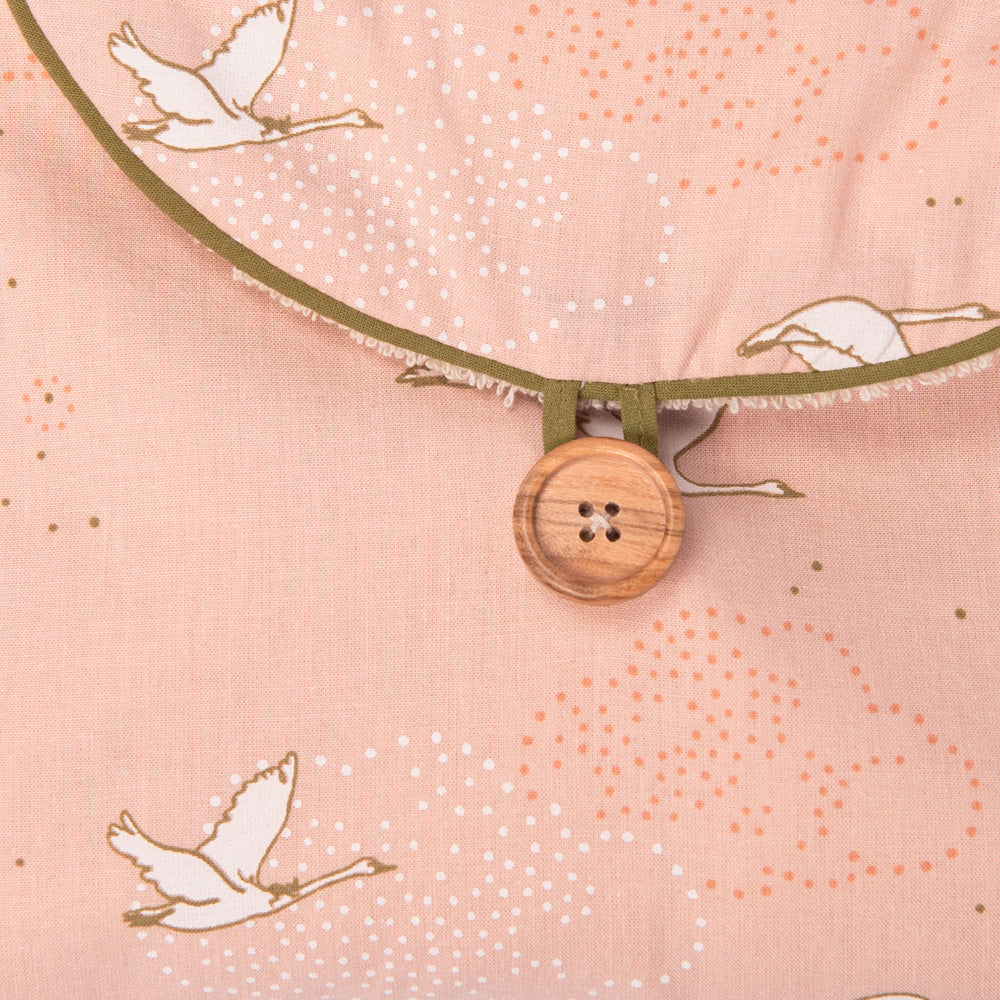 This beautifully crafted mat features a delicate pale pink background adorned with a soft, dreamlike pattern of swans and clouds. Inside, a plush, absorbent terry cloth lining keeps baby comfortable during changes, while the wooden button closure adds a touch of classic charm.