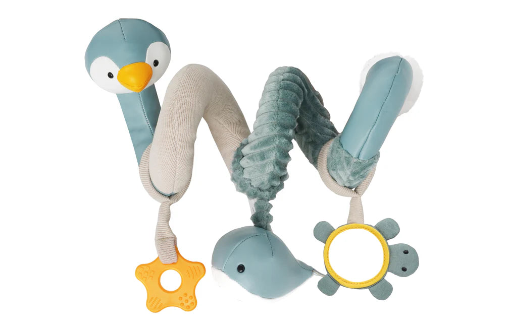 The Little Big Friends activity spiral will amuse babies when in a stroller or a car seat. It can also be used in a bed or a crib. With the curiosity triggered by the activity spiral, babies’ senses are enhanced. Playful hanging toys are included to explore fun activities: animal maracas, a squeaker, a mirror, or a teether.