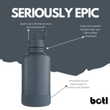 64oz / c.2000ml thermal insulated Canteen stainless steel water bottle supplied with PP sports cap with spout and internal straw and base protecting silicone. Newly updated Epic bottle – with Lois O’Hara design logo. Beer Growler, Gym keg, Daily water intake reminder.