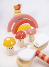 A whole play experience in one handy box that's perfectly designed for your 18-24 month old. This garden playtime box contains 4 fun early learning toys and makes a wonderful gift. 5 part stacking tree with bird that requires placing the rings in order to stack. 4 part stacking rainbow tunnel that can be placed in a variety of ways as part of open ended play. 3 part toadstool hammer game which introduces cause and effect and a dragonfly clacker.