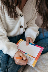 The daily desk pad is a 50 page A5 notepad with space to plan the day's appointments, a mini to-do list, space for a positive note to yourself, a water intake tracker and self-care reminder section. The notepad is glued on the top edge with a cardboard backing and the pages are 100gsm uncoated paper.